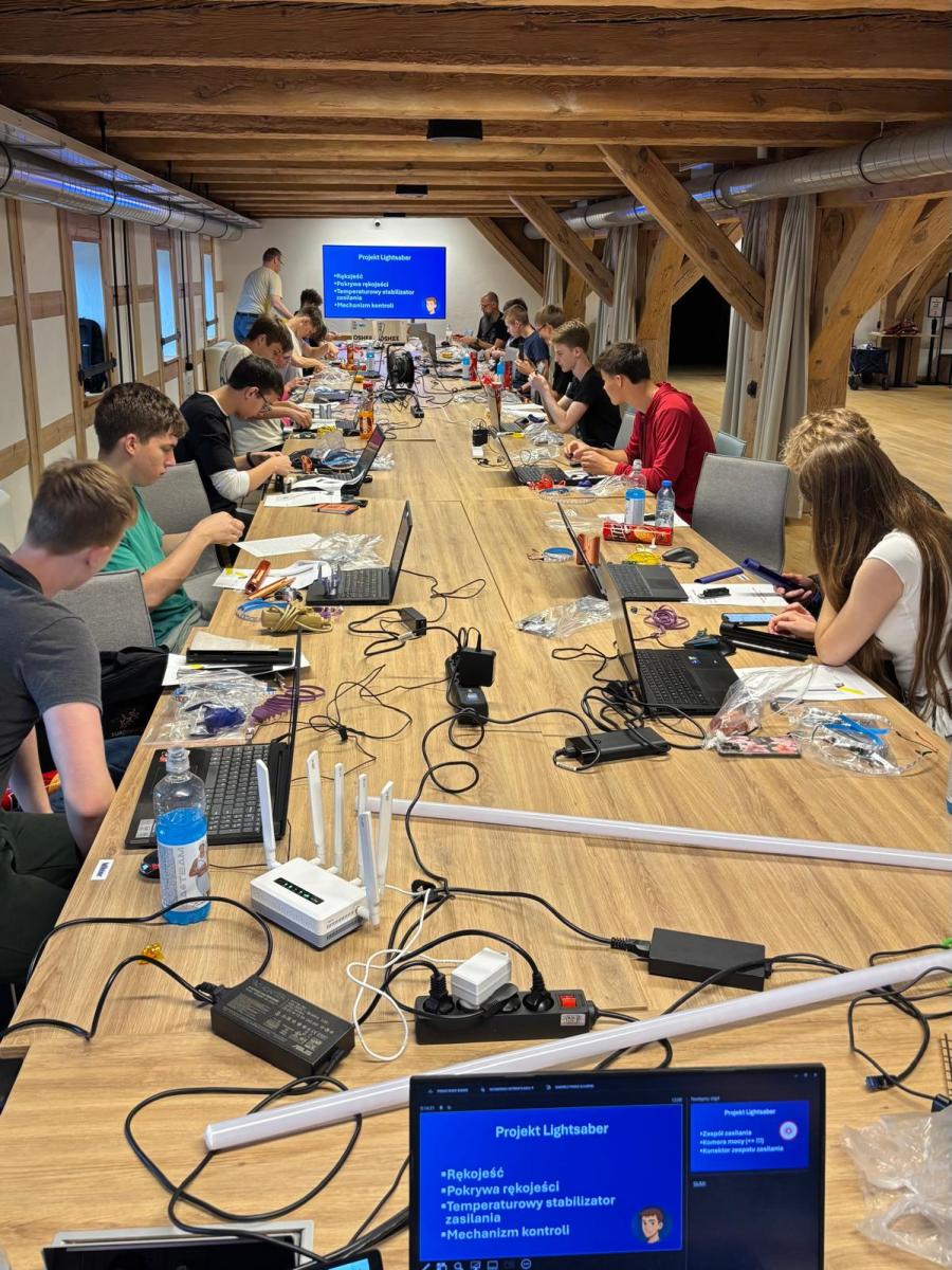 Po krótkim wprowadzeniu teoretycznym wszyscy przystąpili kolejno do pobrania niezbędnych plików z serwera, uruchomienia oprogramowania Thonny na komputerach i podłączenia Raspberry do komputera. Po zainstalowaniu interpretera MicroPython każdy wgrał do pamięci urządzenia kod sterujący podłączonymi komponentami. Składały się na nie przycisk uruchamiający, buzzer wydający dźwięki oraz taśma LED. Po wgraniu kodu wszystkie elementy elektroniczne zostały połączone i umieszczone wewnątrz rękojeści przygotowanej z pomocą druku 3D.