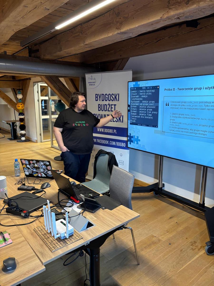 Po dość długiej przerwie miałem okazję po raz kolejny poprowadzić warsztaty związane z tematyką Linuxową w bydgoskich Młynach Rothera. Tym razem opowiedziałem młodzieży o tym, w jaki sposób zarządzanie użytkownikami, grupami oraz nadawanie uprawnień może ułatwić zarządzanie dużymi zbiorami danych, na których pracuje wiele grup i użytkowników. Całość była zrealizowana w ramach współpracy z CODEBY przy projekcie Naukowa Akademia Star Wars.