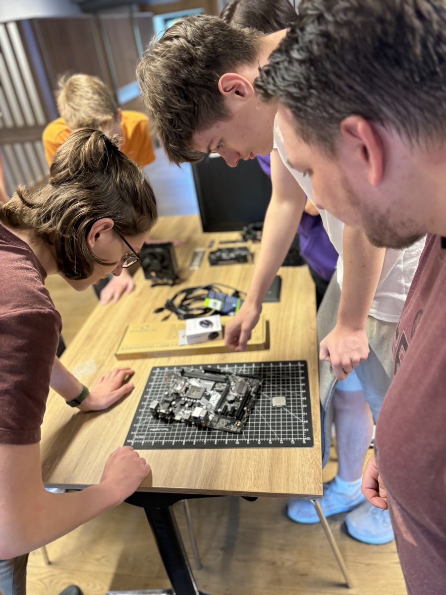 Uczestnicy warsztatów bardzo nie mogli doczekać się składania komputerów, co można było zobaczyć nie tylko po wyostrzonym wzroku ale też nieopanowanej chęci dotknięcia wszystkiego, co znajdowało się na stole. Obydwie grupy złożyły komputer zaczynając od ułożenia stabilnie płyty głównej na stanowisku roboczym. Następnie zamontowany został procesor, chłodzenie procesora i pamięć RAM. Płyty wylądowały następnie z zasilaczami w obudowach, aby w końcu podłączyć dyski i karty graficzne. Po drobnych poprawkach (dociśnięcie pamięci RAM czy chłodzenia CPU) obydwa zestawy wystartowały i można było przejść do dalszych testów.