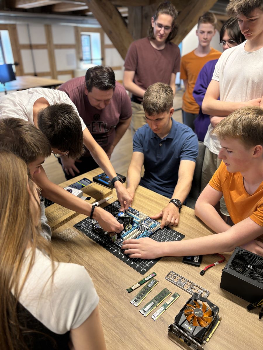 Uczestnicy warsztatów bardzo nie mogli doczekać się składania komputerów, co można było zobaczyć nie tylko po wyostrzonym wzroku ale też nieopanowanej chęci dotknięcia wszystkiego, co znajdowało się na stole. Obydwie grupy złożyły komputer zaczynając od ułożenia stabilnie płyty głównej na stanowisku roboczym. Następnie zamontowany został procesor, chłodzenie procesora i pamięć RAM. Płyty wylądowały następnie z zasilaczami w obudowach, aby w końcu podłączyć dyski i karty graficzne. Po drobnych poprawkach (dociśnięcie pamięci RAM czy chłodzenia CPU) obydwa zestawy wystartowały i można było przejść do dalszych testów.